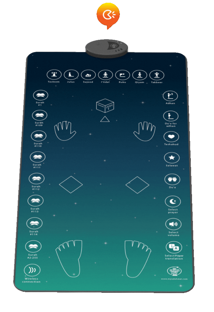 Built-In Sensors! Hidayamat for Adults is equipped with touch-sensitive sensors placed where the hands, feet, and forehead go during prayer. These sensors respond to your movements, providing real-time instructions, Qur’an recitations, and Duas to help you confidently perform Salah.